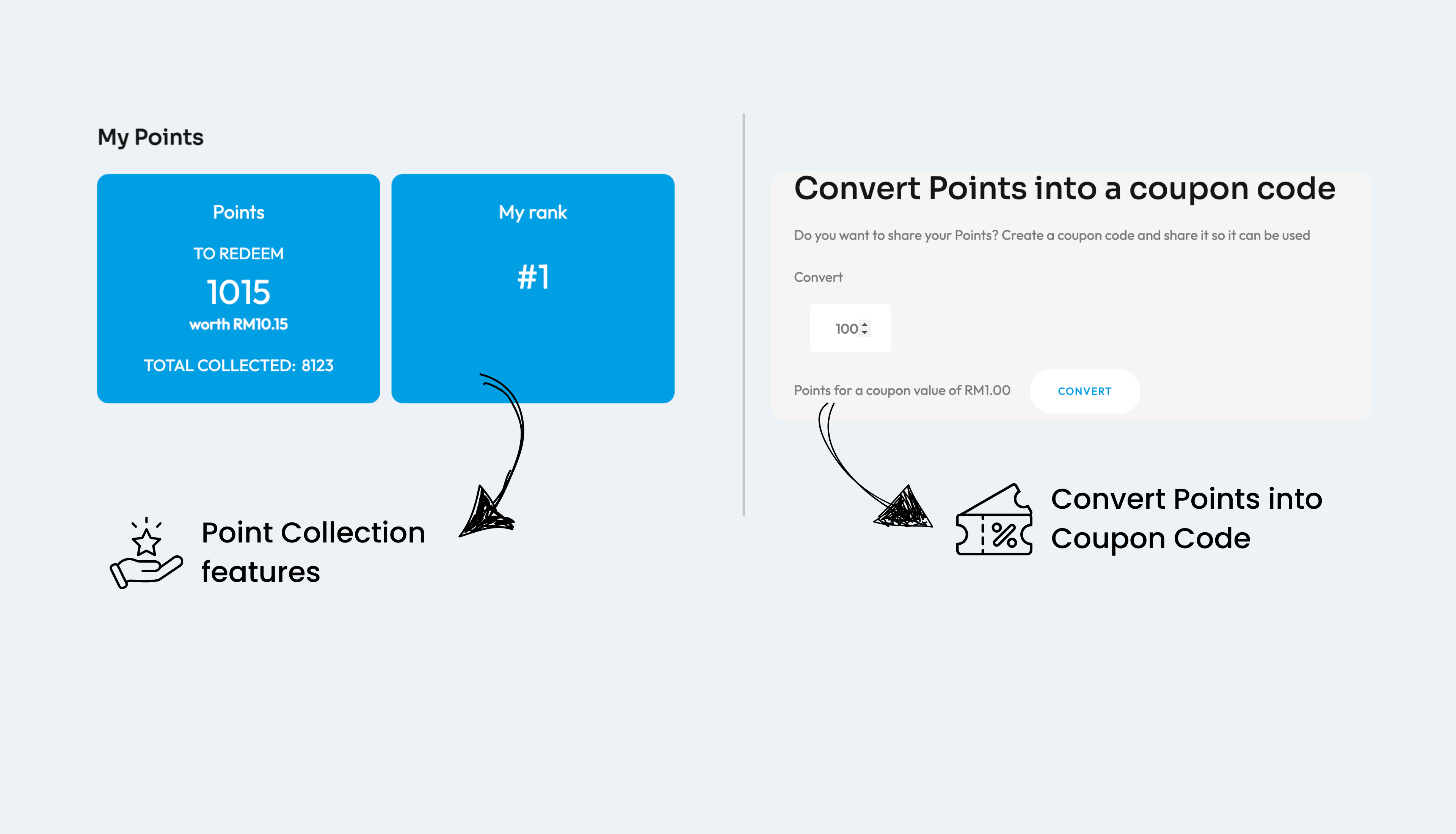 Members can use points to claim discount coupons Redeem your points for coupon codes and enjoy great deals! Every 100 points unlocks RM1 to use on your next purchase.